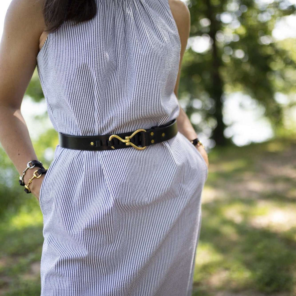 Simply the best Kentucky name plate belt available, do not be fooled by cheaper imitations. All of our belts are made from ultra durable Bridle Leather, the same leather used by all of the local tack shops for anything from saddles to halters. Featured in dark black with a classic hoof pick buckle and an incredible name plate made out of real harness brass. All of our name plates are machine engraved. Your belt will come stiff and break in perfectly over time. All of our belts come gently rolled and tied in a burlap sack. Handmade here in Lexington, Kentucky.