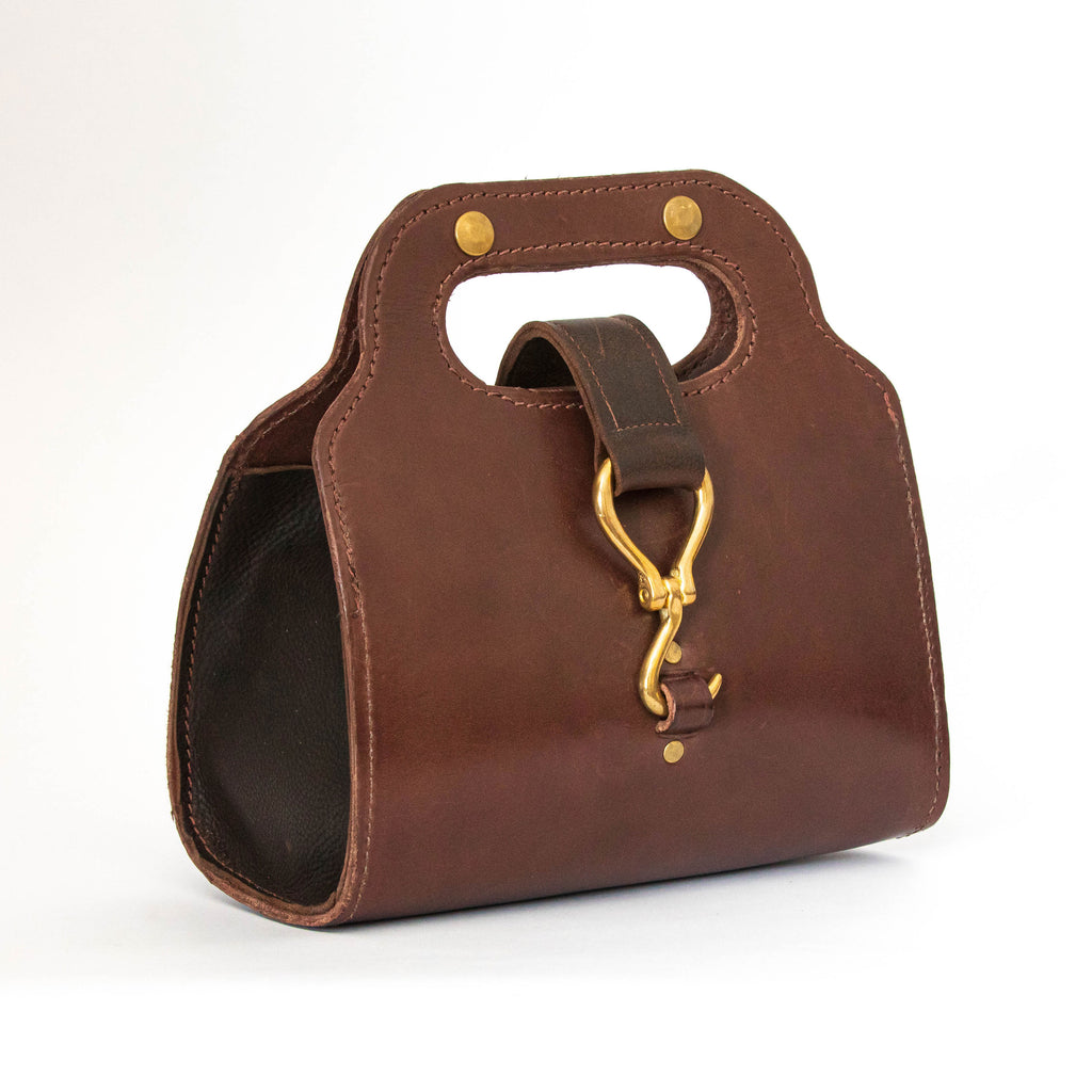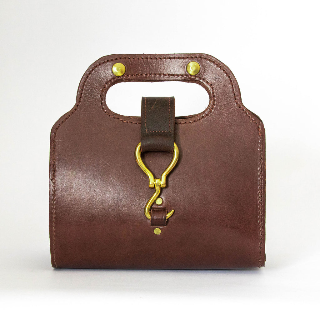 Beauty is the only word to describe this petit handbag made from saddle bridle leather with hoof pick fold over closure and brass snap handle. So fun for the race track or a lovely evening out.