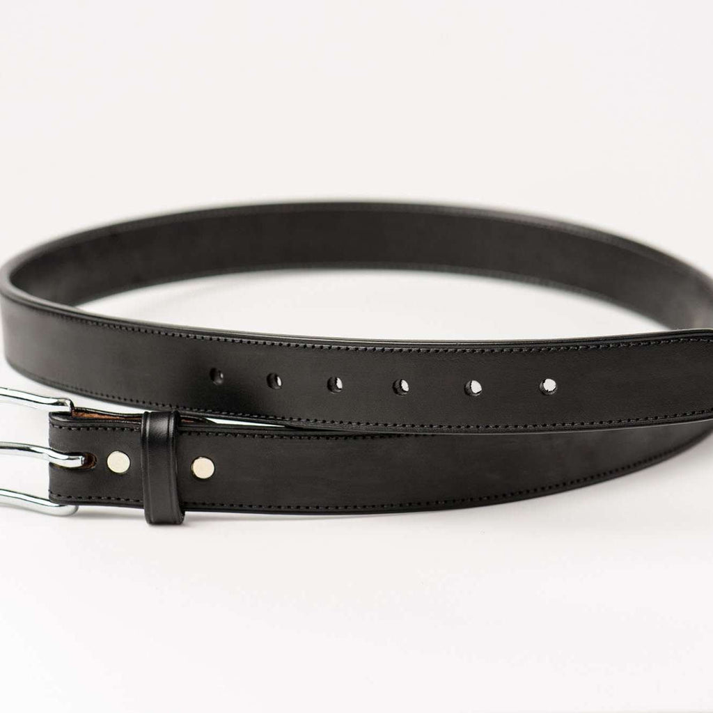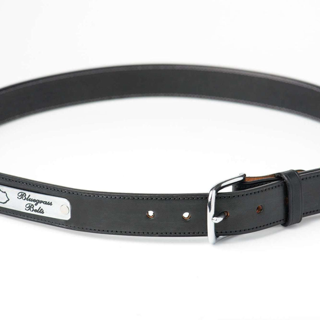 Our Midnight Black Thoroughbred Bridle Leather Belt is a rich midnight black color. It is drum dyed for complete hue penetration with subtly hand stitched ends for detail. Our one-of-a-kind belt features a polished single prong silver-tone buckle, for long lasting durability. As with any quality bridle or saddle maker, our pride is in the finish of the leather of each piece. Bridle leather has both the flesh and grain side of the leather stuffed with greases and finished with wax which allows for long lasting wear for years to come. This labor intensive process goes into each of our leather pieces handcrafted for our clients' discerning palettes. Your Thoroughbred Belt will arrive stiff, in a custom burlap dust bag and require wear to mold to your specific measurements. Handmade here in Lexington, Kentucky, also known as the "Horse Capital of the World," it is the heart of the state's Bluegrass region.